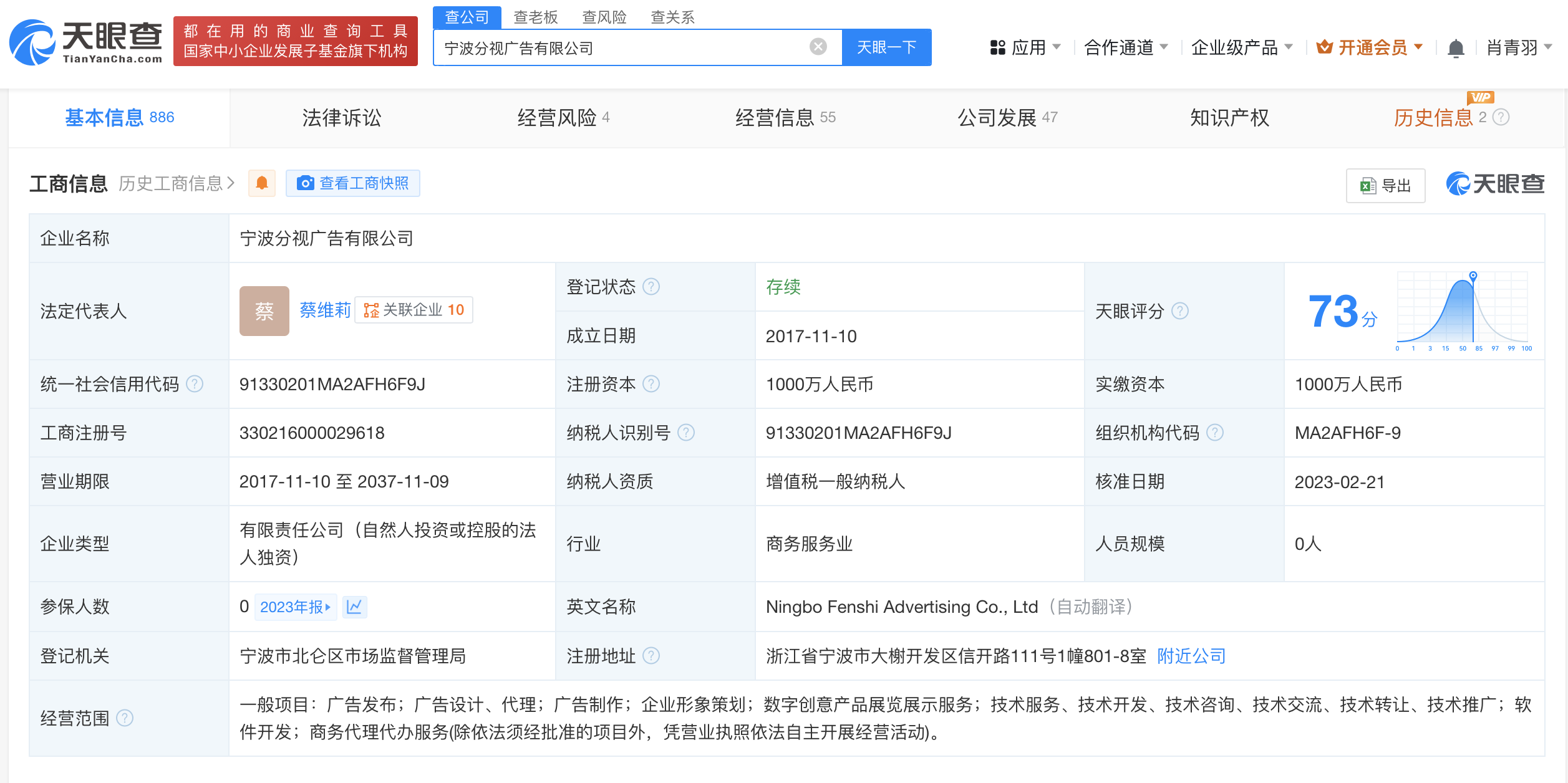 天眼查经营风险信息显示,近日,宁波分视广告有限公司新增一则简易注销公告,公告期为2025年2月8日至2025年2月27日。