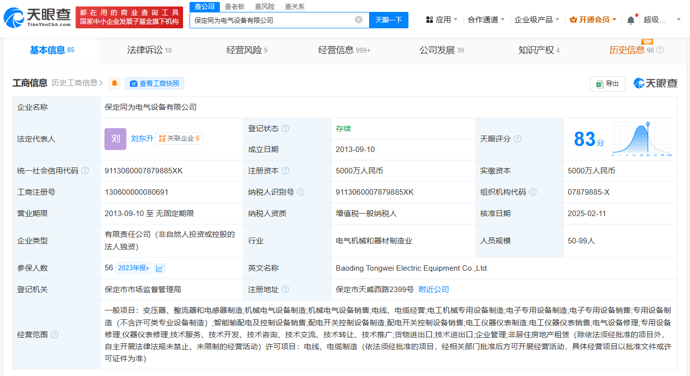 保定同为电气设备有限公司成立于2013年9月,法定代表人为刘东升,注册资本5000万人民币。对外投资信息显示,该公司持有保定天威保变电气股份有限公司、天威新能源系统工程(北京)有限公司等公司股份。